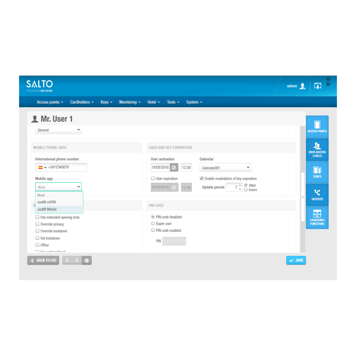 0004 - Online-MonitoringMit dem Online-Monitoring lassen sich nicht nur Batteriestände und die Gültigkeit von Zutrittsberechtigungen in Echtzeit überwachen, sondern auch Zutrittsereignisse und Alarme, z.B. Tür-offen-Alarm.  | 0016-1 - JustIN MobileDie Funktion Mobile Nutzer erlaubt es registrierten Anwendern, ihr Smartphone mit Bluetooth als Zimmerschlüssel zu verwenden und Zutrittsberechtigungen OTA (Over the Air) zu erhalten (JustIN Mobile) oder ihr Smartphone via NFC als Update-Punkt zu verwenden(JustIN mSVN). Mit ProAccess SPACE kann die entsprechende Funktion ausgewählt und verwaltet werden. Preis pro Nutzer und Jahr.  | |