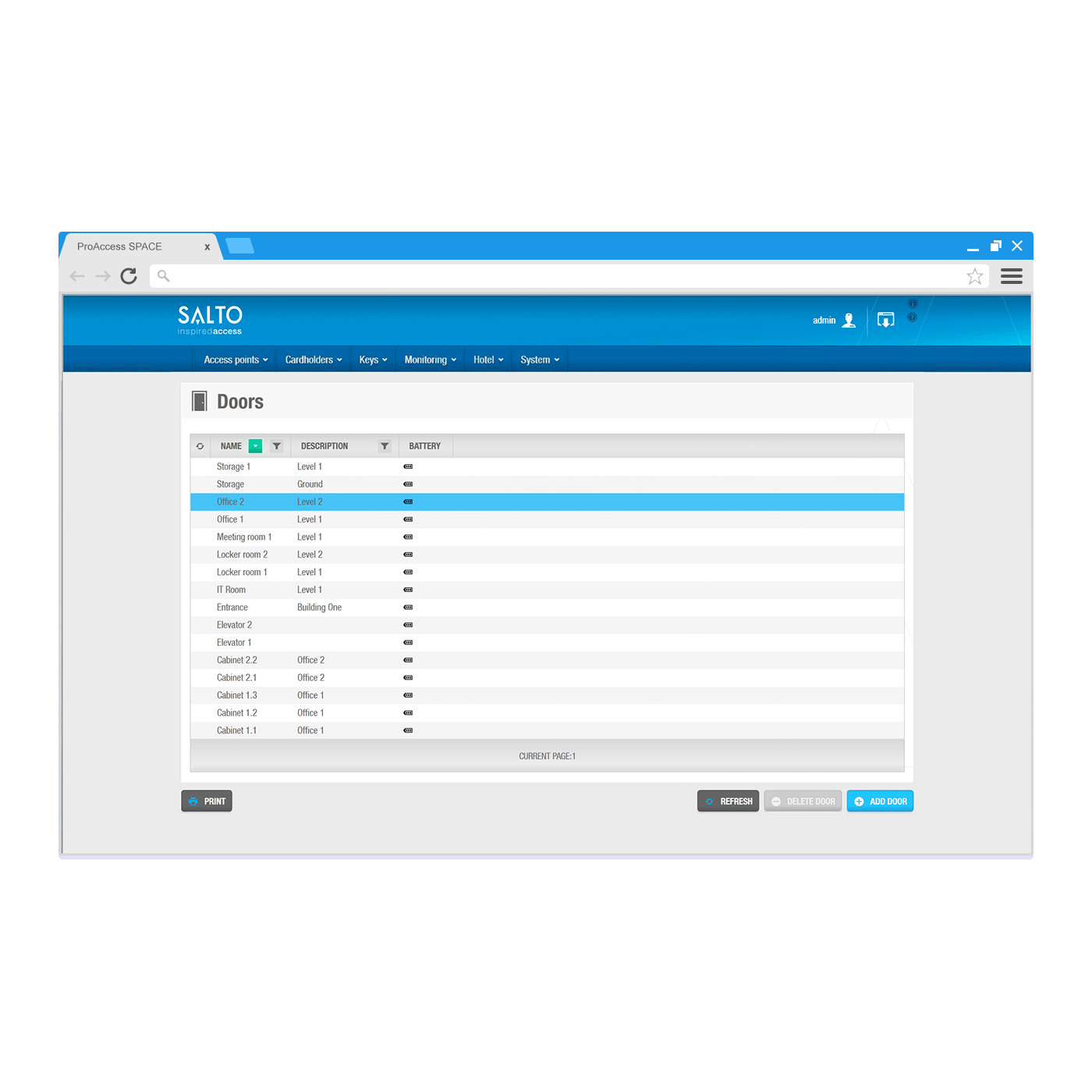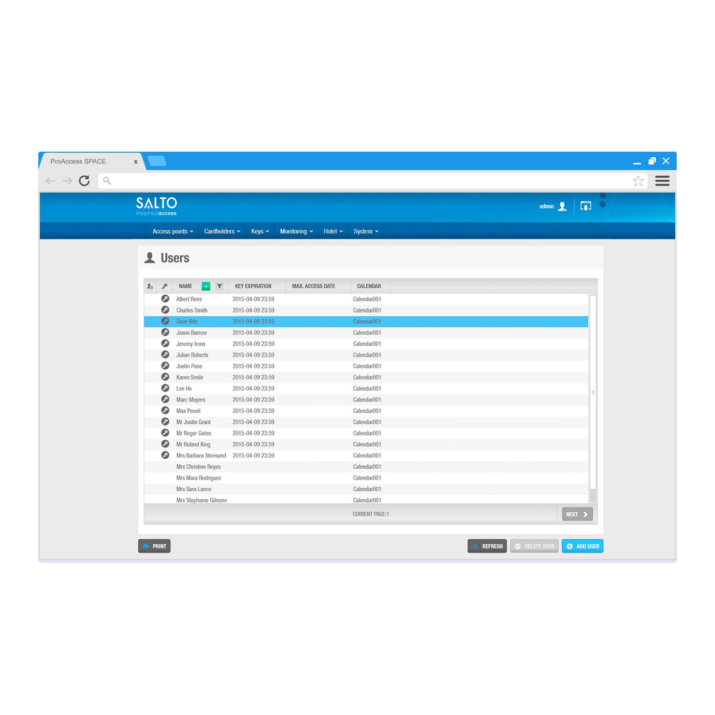 ProAccess SPACE von SALTO ist ein außergewöhnlich leistungsfähiges Zutrittsmanagementsystem, mit dem Offline-, Wireless-, IP-Online- und mobile Zutrittspunkte in einer Plattform verwaltet werden können. Es ermöglicht u.a. das Management von Nutzern und Türen nach Zeitzonen und Kalendern, die Protokollierung von Daten aus den Türkomponenten, die automatische Statuseinstellung von Türen und Anti-Passback.