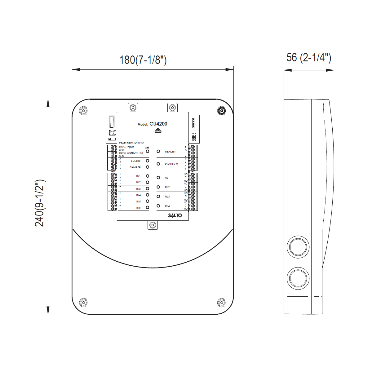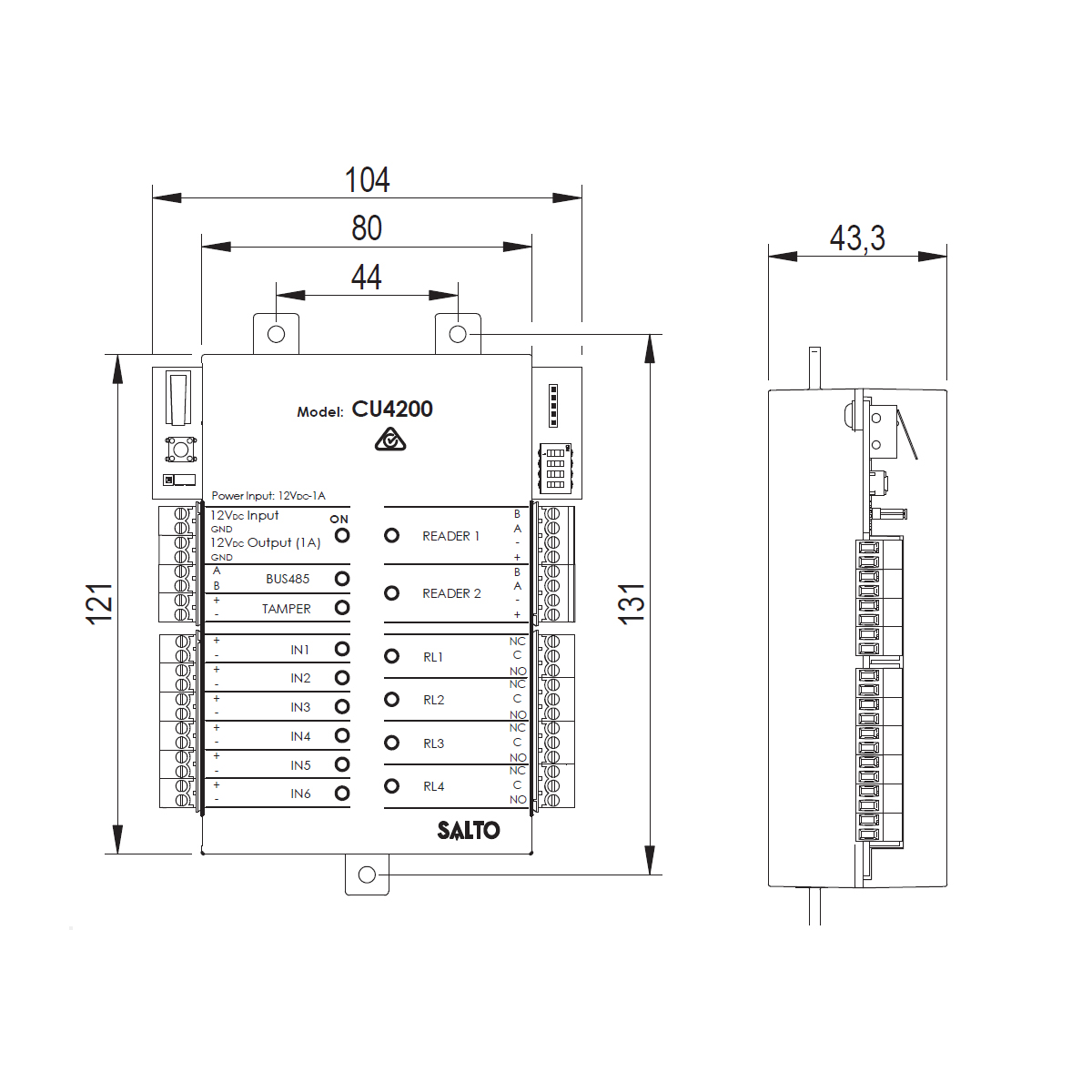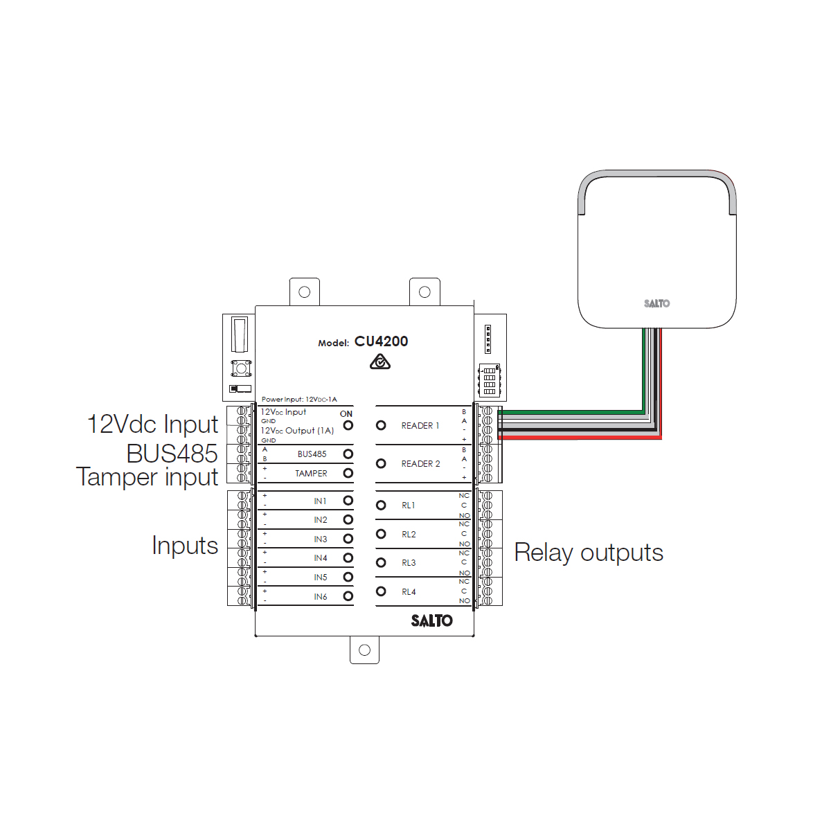 Die SALTO - XS4 2.0 Erweiterungssteuerung - CU4200x ist eine Erweiterungssteuerung, die keine eigene IPAdresse benötigt. Sie kann verwendet werden als untergeordnete Steuerung mit der SALTO Online- Steuerung (CU42E0) oder als Offline-Steuerung als Teil des SALTO Virtual Network (SVN). Steuerung im Offline-Betrieb von 1 Tür (max. 2 Wandleser mit gleicher Berechtigung). Im Online-Betrieb ist die Steuerung von 2 Türen oder 1 Tür (Ein-/Austritt) mit unterschiedlichen Berechtigungen möglich. Die CU42000EU dient zur Verwendung mit den SALTO Wandlesern WRDxxx und WRMB004 und sämtliche Kommunikation mit der CU4200 erfolgt verschlüsselt.