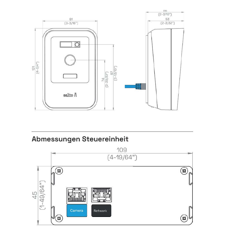 - Anschluss Steuereinheit: Salto XS4 Face Kabel (CAT6a SSTP LSOH), 3 m, im Lieferumfang enthalten