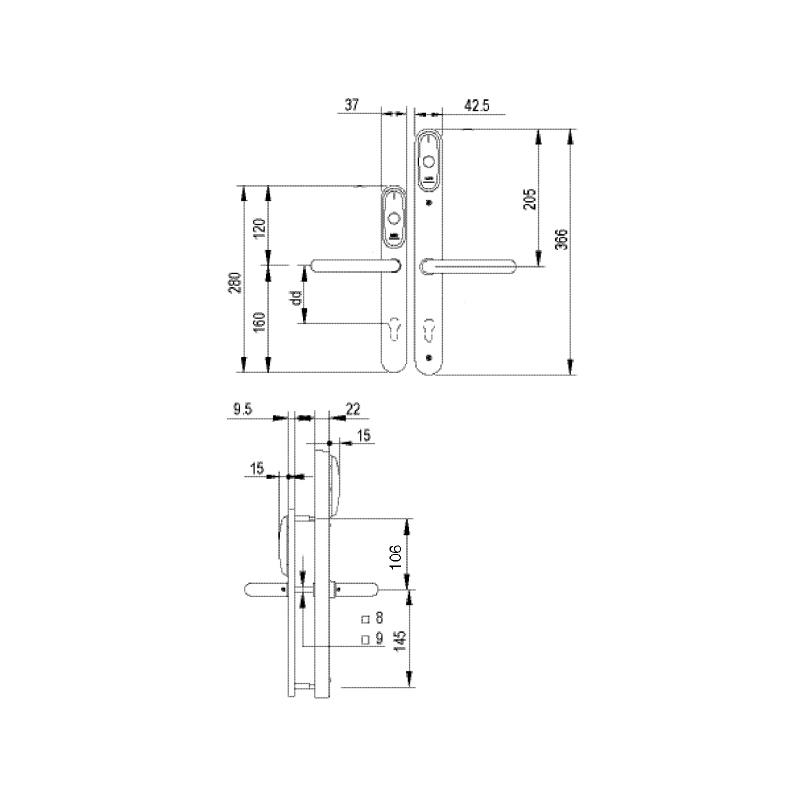 - Maße Außenbeschlag: 280 mm x 37 mm x 9,50 mm