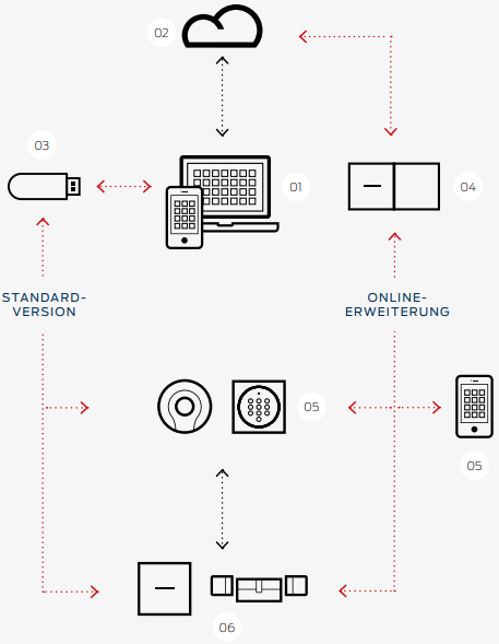Für Programmierung der Zylinder ohne LockNode wird nur der USB-Programmierstick (03) und der Zugang zur Web-App (01) benötigt. Zutrittsänderungen müssen in der Web-App vorgenommen werden und dann wieder via USB-Programmierstick auf das Vorhangschloss (06) programmiert werden.