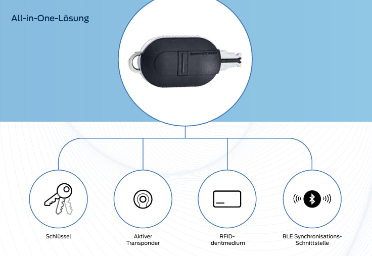 • All-in-One-Lösung: Key, Aktiv-Transponder, BLE Kommunikations-Schnittstelle und optionales RFID-Identmedium in einem