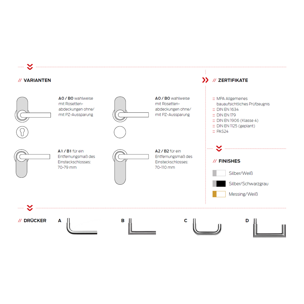 | Zertifikate | MPA Allgemeines bauaufsichtliches Prüfzeugnis DIN EN 1634 DIN EN 179 DIN EN 1906 (Klasse 4) DIN EN 1125 DIN EN 16867 PAS24  |