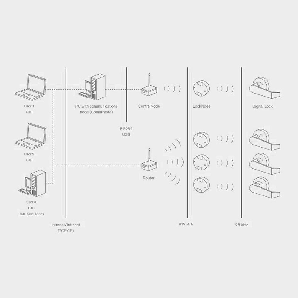 - Alle Schließkomponenten können kabelfrei vernetzt werden. Bei Bedarf aber z.B. auch über ein schon vorhandenes Ethernet oder andere Datenleitungen (RS485)